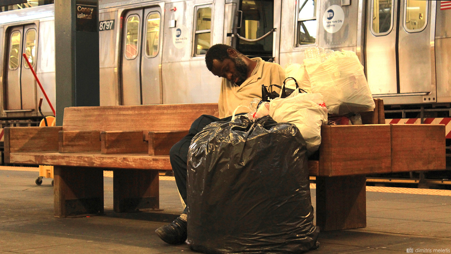 Coney Island, homeless, metro, trash bags, garbage bags,